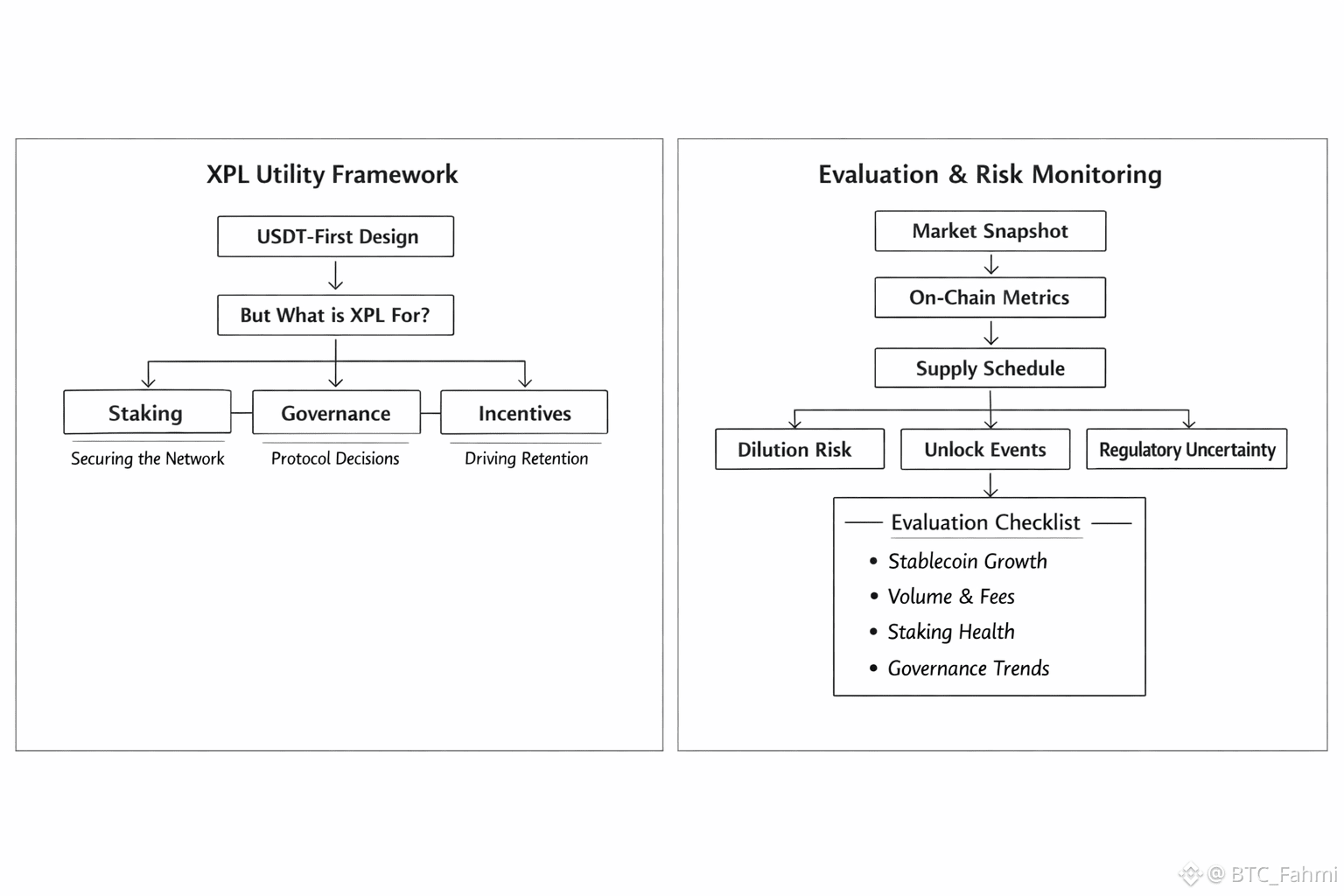 If you are evaluating XPL as more than a short term trade, treat it like you would evaluate a payments company, not a meme market. Watch whether stablecoin balances on Plasma keep growing whether app fees and volumes stabilize rather than spike and fade, whether staking participation looks healthy, and whether governance decisions start to matter in ways you can measure. Then read the tokenomics and vesting calendar yourself, track the next unlock dates and only size exposure in a way you can live with through volatility. The best edge here is not being early, it is being precise about whether Plasma is solving the retention problem in the real world, not just on launch week charts.
