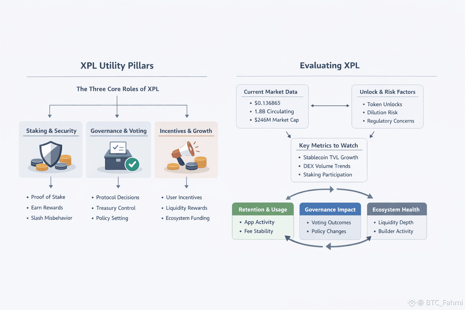 That design choice creates an immediate question for traders and investors: if basic stablecoin transfers do not require you to constantly buy the native token just to move money, what is XPL actually for? The honest answer is that XPL becomes less of a toll token and more of a control and alignment token. It is the asset that secures the network through staking, coordinates long term decisions through governance, and funds the economic incentives that decide whether Plasma becomes sticky infrastructure or a chain people try once and forget.