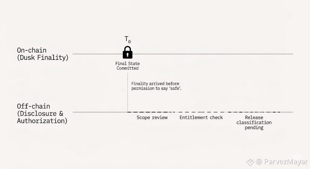 There's no incident to escalate. No rollback to justify urgency. Just a finalized Dusk state sitting there, correct and irreversible, while the organization realizes it never decided who was allowed to explain it out loud.