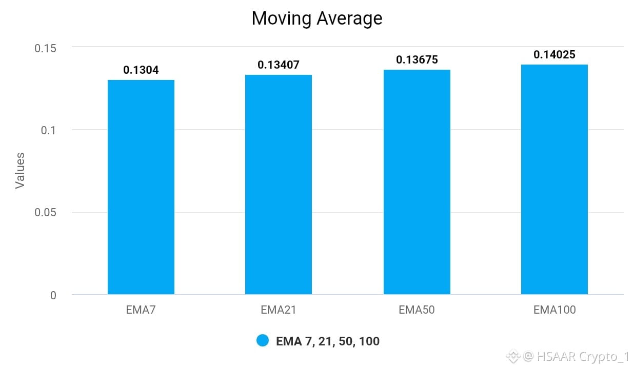 EMA Death Cross: The EMA(7), EMA(21), and EMA(50) are all sloping downward, acting as dynamic resistance. The price is currently pinned below the EMA(100) at 0.14025.