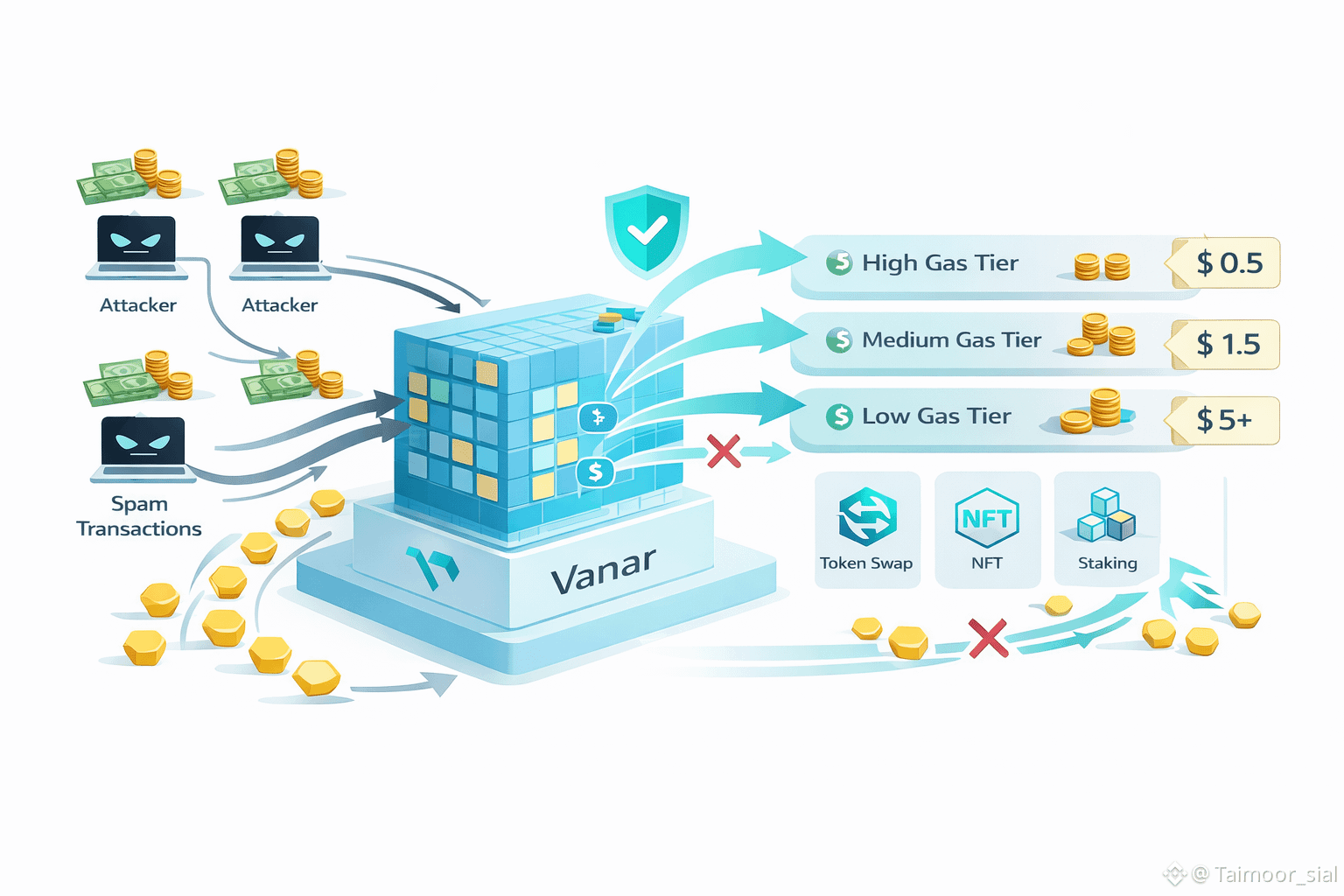Vanar usability, scalability, and security were the main priorities in its design. Low-cost blockchains face a major challenge with spam and block saturation attacks such as when an attacker sends a huge number of transactions to create congestion in the blocks, reducing their performance. To counter this problem, Vanar has implemented a fixed fee and tiered pricing system that were carefully designed based upon extensive testing.