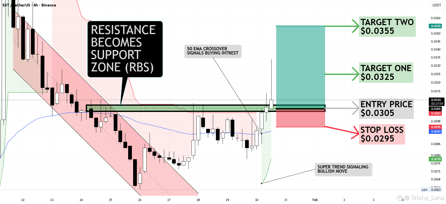 Momentum is supported by multiple confluences: the Supertrend indicator has flipped bullish, signaling sustained buying pressure, and the 50-period EMA crossover further validates the upside bias. Price is expected to retrace into the RBS zone, offering a high-probability pullback entry before continuation to the upside.
