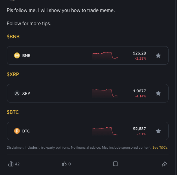 Token tags (for example, $BTC) are not just labels! They are the secret that helps you reach those who are truly interested in your content. The 'Write and Earn' commission is credited to your wallet only when a user makes a relevant transaction after clicking on the token tag or chart mentioned in your post. Mindless addition of tags will not bring you clicks.