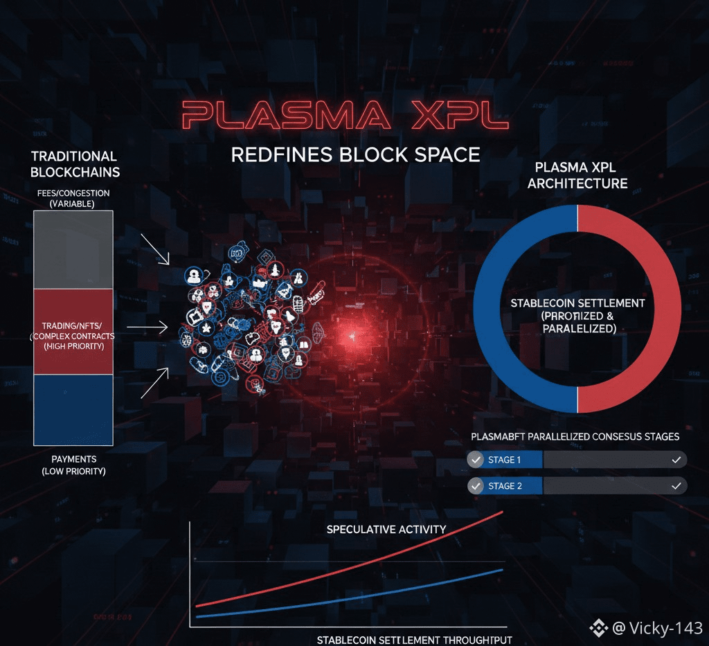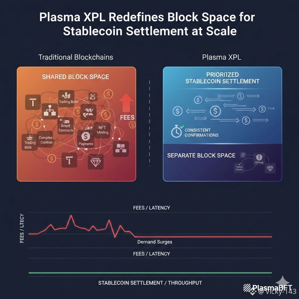 Most blockchains treat the block space as a shared resource where every type of activity competes equally. Trading bots complex smart contracts NFT minting and the payments all fight for inclusion. When demand rises payments are pushed aside and fees surge. This model may work for experimentation but it fails for financial infrastructure. Plasma XPL redesigns how block space is used by prioritizing stablecoin settlement at the protocol level.