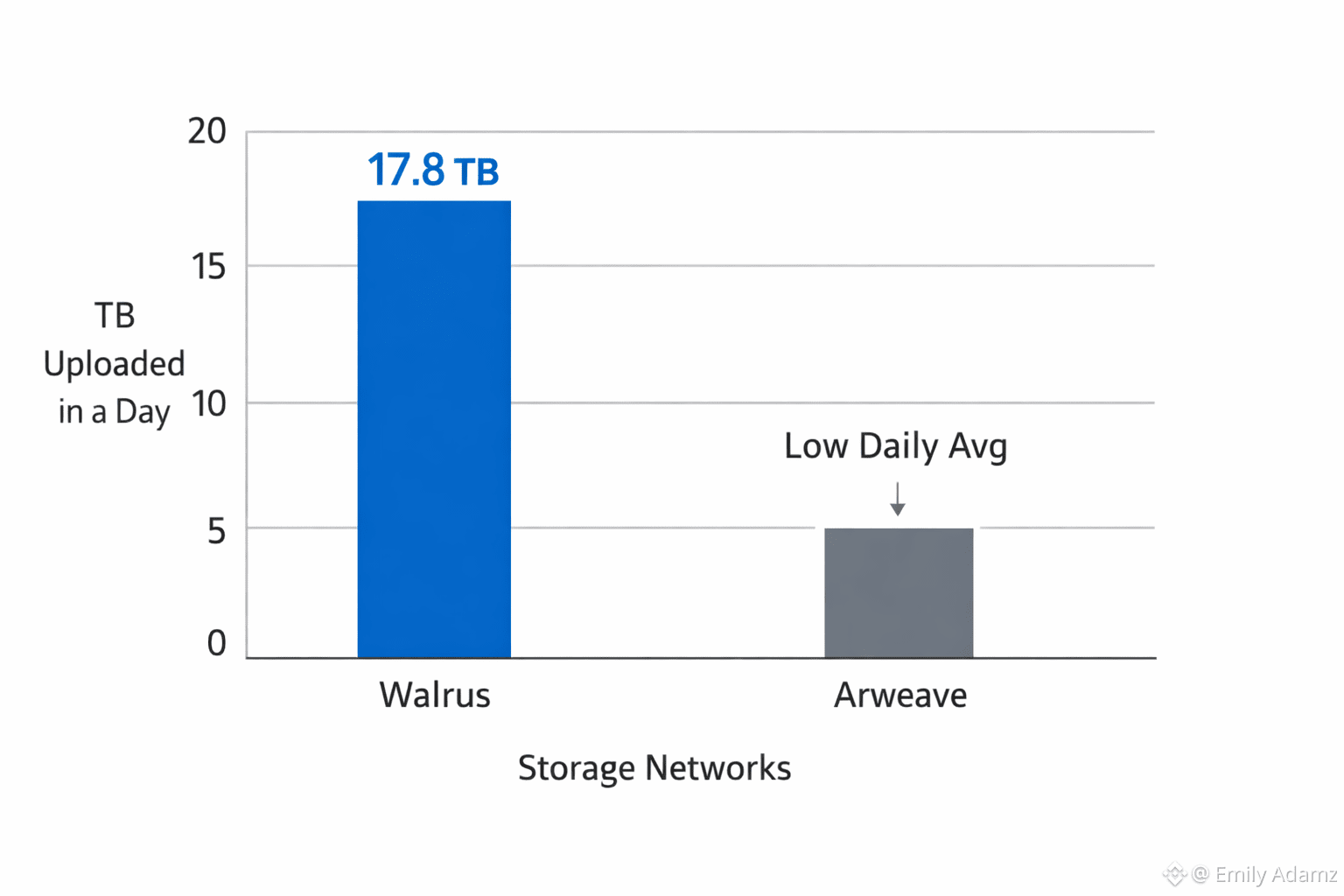 And it’s not just hype—people are already using it. Since launching on mainnet in March 2025, Walrus has carried nearly a year’s worth of real production traffic. Projects like RealTBook park their NFTs here for good, and Unchained Podcast keeps their whole media library safe from central failures. The numbers tell the story: total network capacity is up to 833 TB, with nearly 79,000 GB already in use across more than 4.5 million blobs. January 2026 saw a record 17.8 TB uploaded in a single day, with several other days over 5 TB. That’s faster growth than Arweave, which sits at about 340 TB after years. Big players are jumping in too—Alkimi Exchange is using Walrus for ad data in Trusted Execution Environments, Omura is layering on AI search for easier discovery, and Team Liquid just moved their massive video archives over. That’s one of the biggest datasets the system’s ever seen.