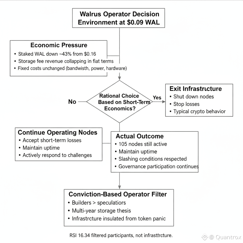 The operators who would quit at $0.09 never joined in the first place. The ones running Walrus infrastructure today are the ones who planned for this scenario. They knew tokens don't go up forever. They knew infrastructure requires surviving volatility. They knew the bet was on storage adoption over years, not token appreciation over months. And they're proving they meant it by continuing operations when every market signal says stop.