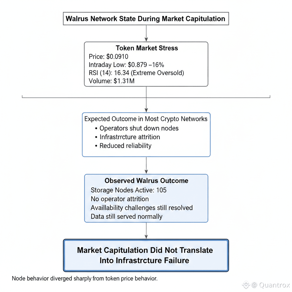 I honestly expected to see Walrus operators start dropping off when the token broke $0.10 and instead I'm looking at the same 105 nodes that were there at $0.16. WAL sits at $0.0910 right now with RSI at 16.34—that's panic-level oversold that should have infrastructure collapsing. The token briefly touched $0.0879 overnight. That's a 16% crash in 24 hours on top of weeks of sustained decline. And those storage nodes? Still processing availability challenges. Still serving data. Still running infrastructure like nothing happened.
