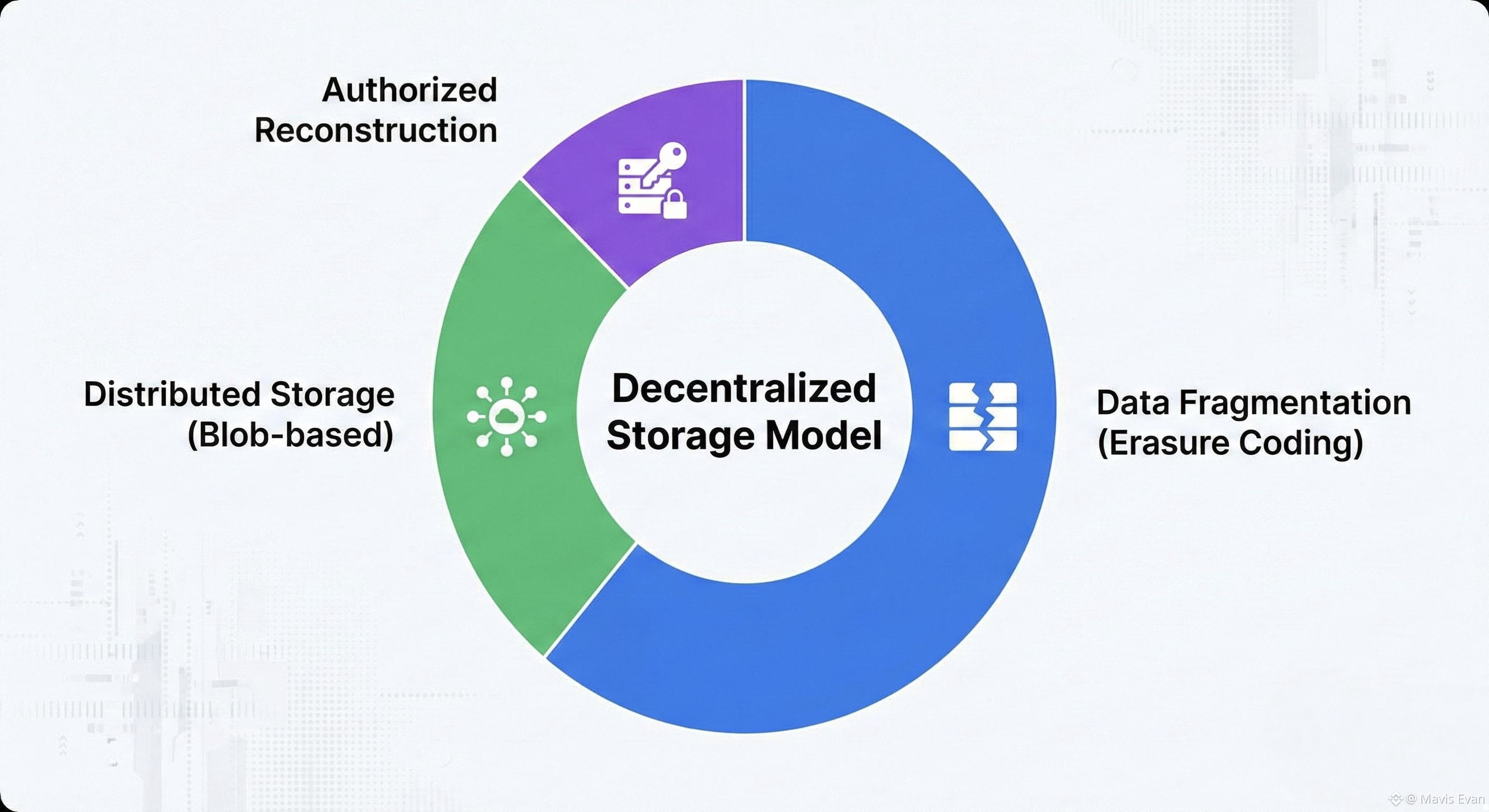 At a conceptual level, the protocol separates the question of verification from the question of exposure. Rather than assuming that all data must be publicly replicated in full, Walrus uses a decentralized storage model that distributes large data objects across the network in fragments. Through erasure coding and blob-based storage, no single participant holds a complete, readable version of the data, yet the system as a whole can reconstruct it when authorization and protocol rules allow. This design acknowledges a basic constraint of decentralized systems: global replication is expensive, and unnecessary replication of sensitive data increases both cost and risk.