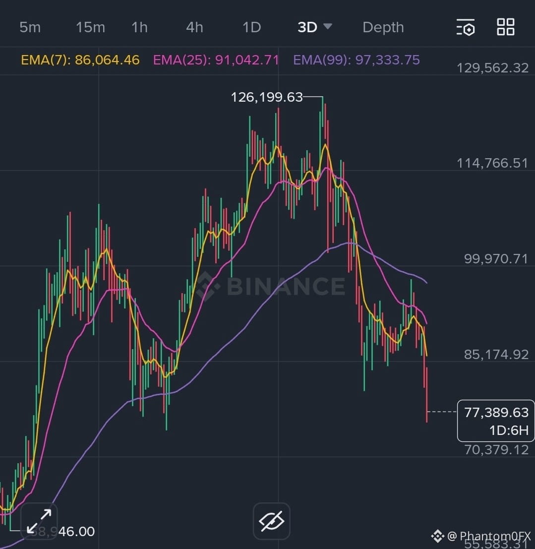 Yo Binance Square fam! $BTC is testing the bulls' resolve right now โ trading at ~$77,389.63 after a nasty 1D drop of 6H (that's some serious red candle action!). With the broader market vibes shifting, is this the dip to buy or a trap door to lower lows? Let's dissect this 3D chart like a pro. ๐ฅ