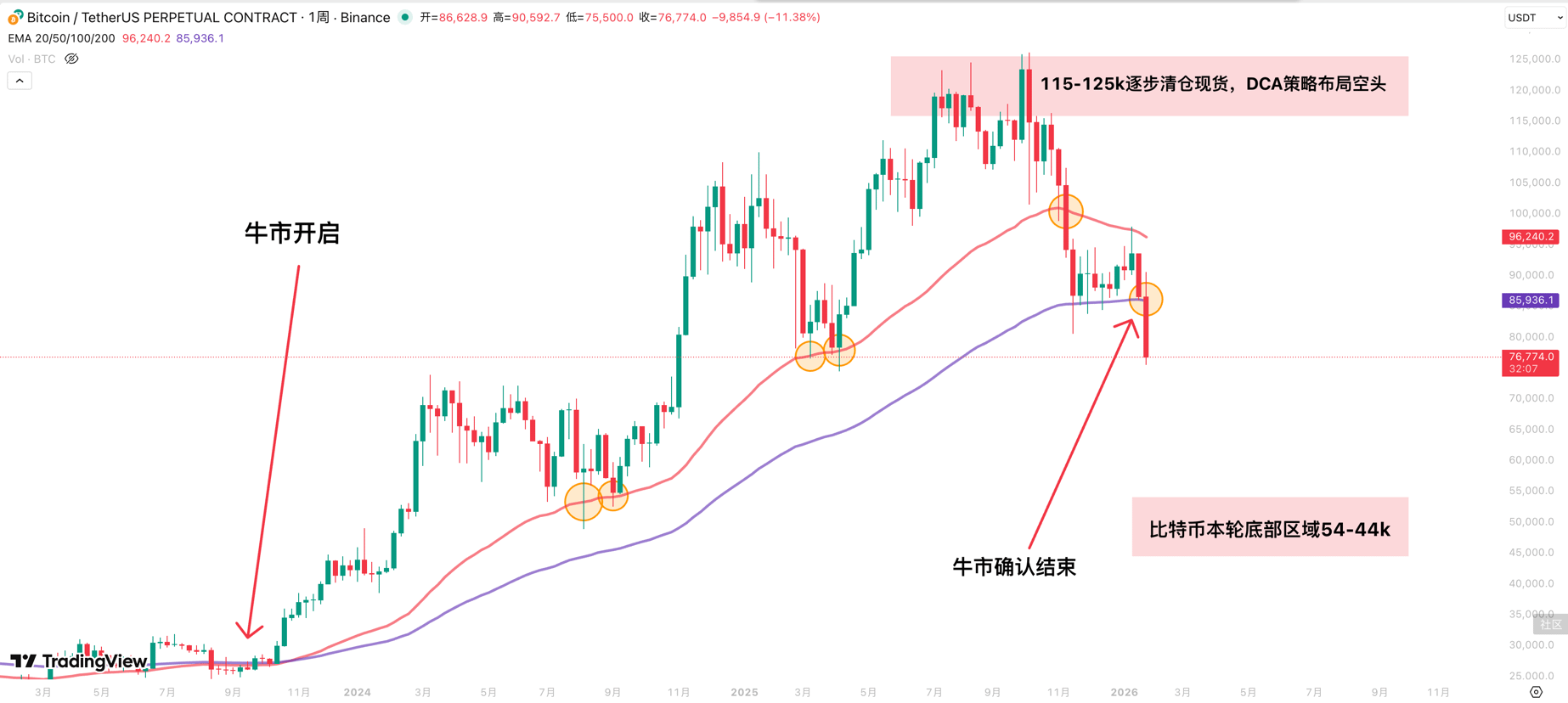 Looking back at October 2023, when the price effectively stood above the MA100 weekly line, I confirmed the start of the bull market from a technical perspective for the first time. Now, as the cycle reaches a similar time node, Bitcoin has reversed and fallen below this key support, which is highly consistent with the rhythm of past bull and bear transitions. This is not a coincidence, but a manifestation of the cycle itself.