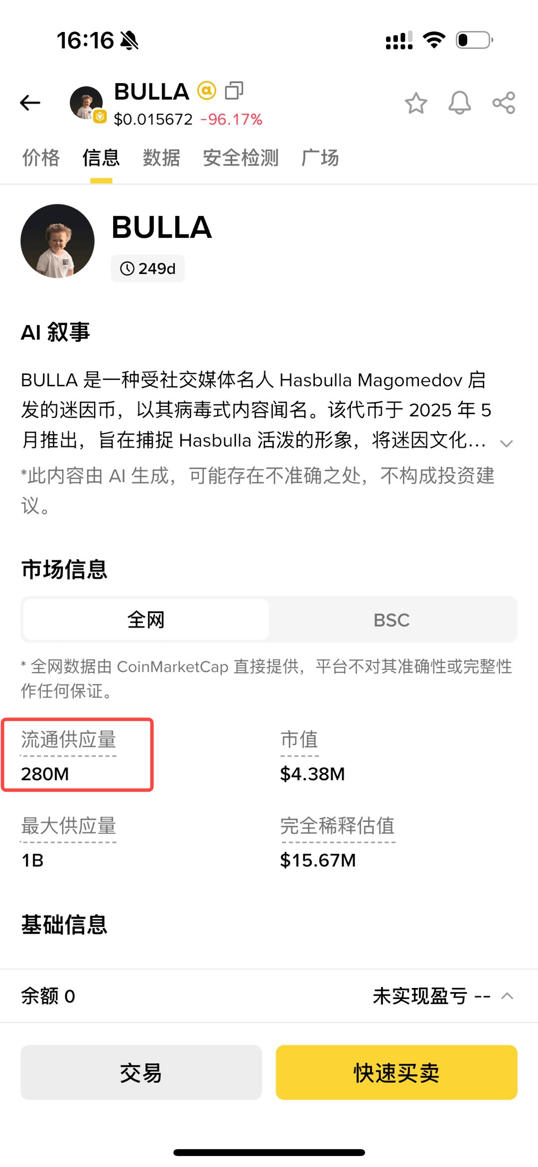 First, we see that after the price drop, BULLA's market capitalization is only 4.38M, and the total circulating supply is 280M.