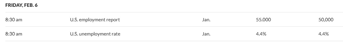 The biggest data of the week is expected on Friday: U.S. Labor Statistics summary of employment. The January jobs report will be released at 8:30 AM Eastern Time, and the number of new job positions is predicted to be 55,000, with the unemployment rate expected to remain at 4.4%.