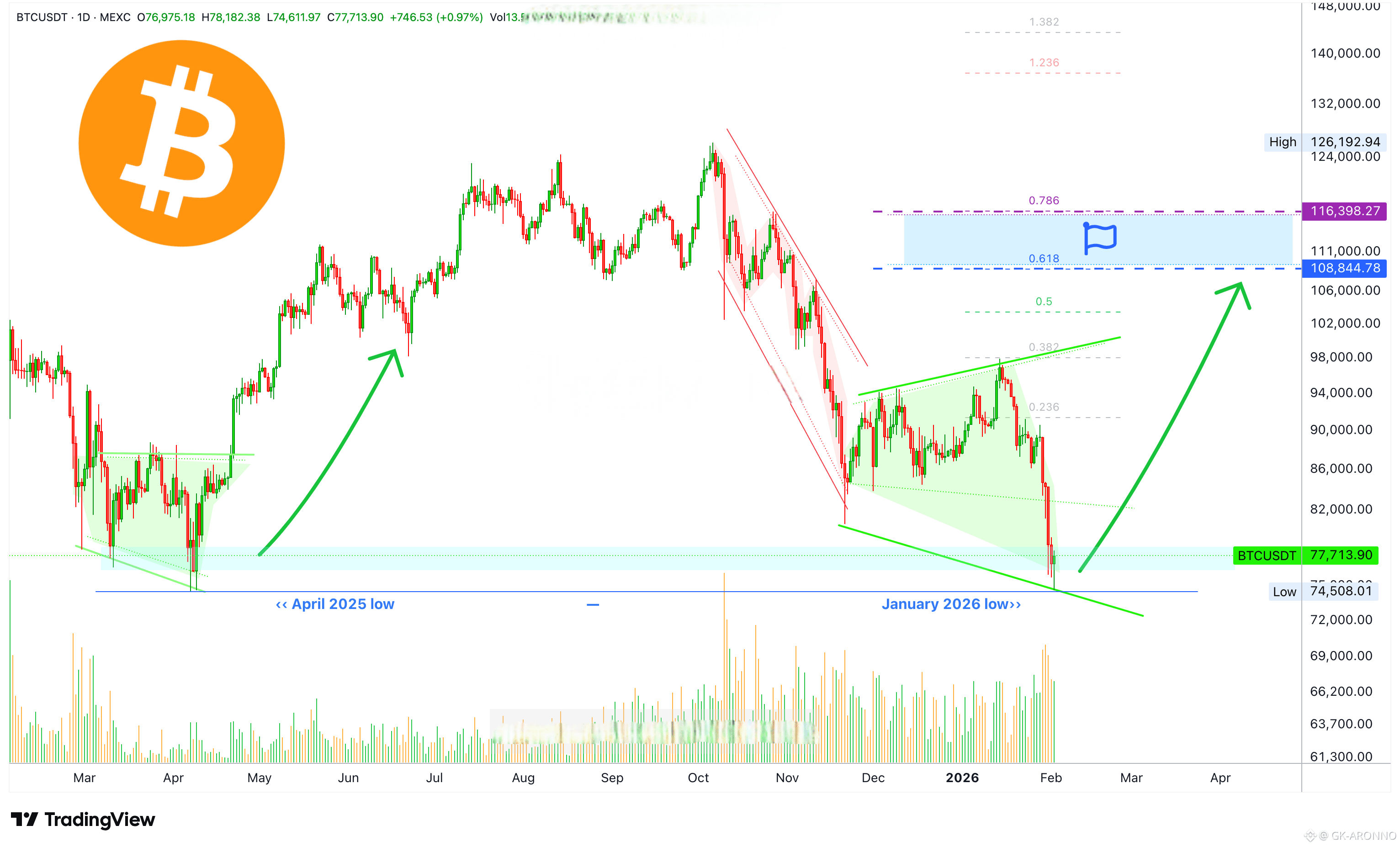 The low 7-April 2025 stands at $74,508. The current low, active now, sits at $74,612, a true double-bottom.