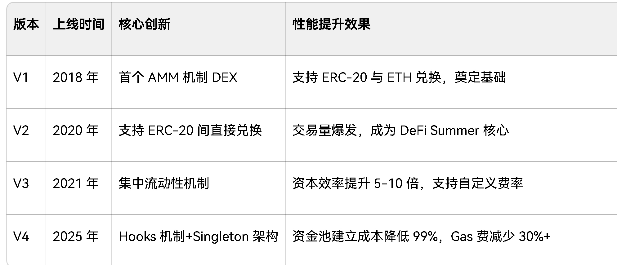 The core goal of Uniswap's version iteration is to enhance capital efficiency, reduce costs, and improve scalability. The key differences between versions are as follows: