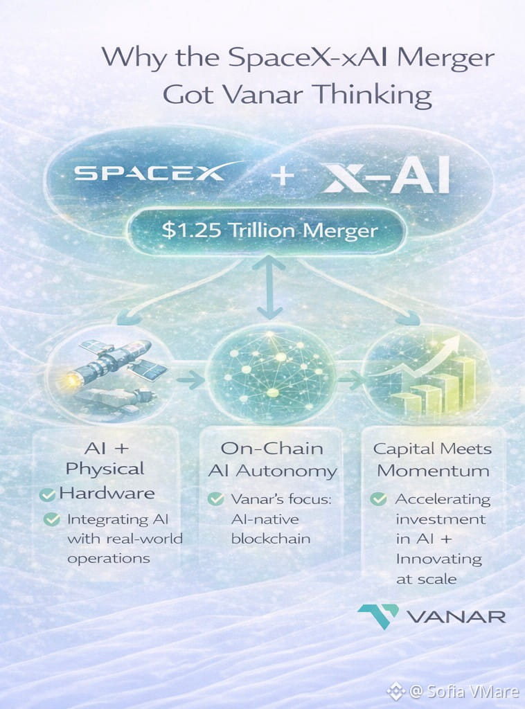 I’ve been glued to my feeds since the big news dropped yesterday about SpaceX acquiring xAI—valued at a mind-blowing $1.25 trillion—and while I’m staking $VANRY from my quiet corner in Lviv (nothing fancy, just my laptop and a cold coffee), Vanar’s official Twitter comments on it really hit home for me. I caught their replies right after the announcements from WatcherGuru, The Verge, and Techmeme started blowing up. Vanar tweeted things like “Big moves! Excited to see how combining space and AI intelligence pushes the boundaries of autonomous systems” and “This is what happens when capital meets momentum.” It wasn’t just generic hype; it felt like they were drawing a line straight to their own AI-native blockchain setup. As someone who’s been testing their agents on testnet for weeks (mostly late nights after work), this merger news made me pause and connect the dots on how big AI shifts like this could ripple into projects like Vanar.