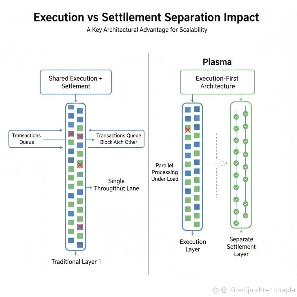One detail that stands out is Plasma’s execution-first design and its separation of execution from settlement. It sounds subtle, but in practice it prevents transactions from piling up and competing with each other. Even when activity increases, operations remain fluid. That kind of architectural choice doesn’t scream for attention, but it’s exactly what supports long-term reliability.