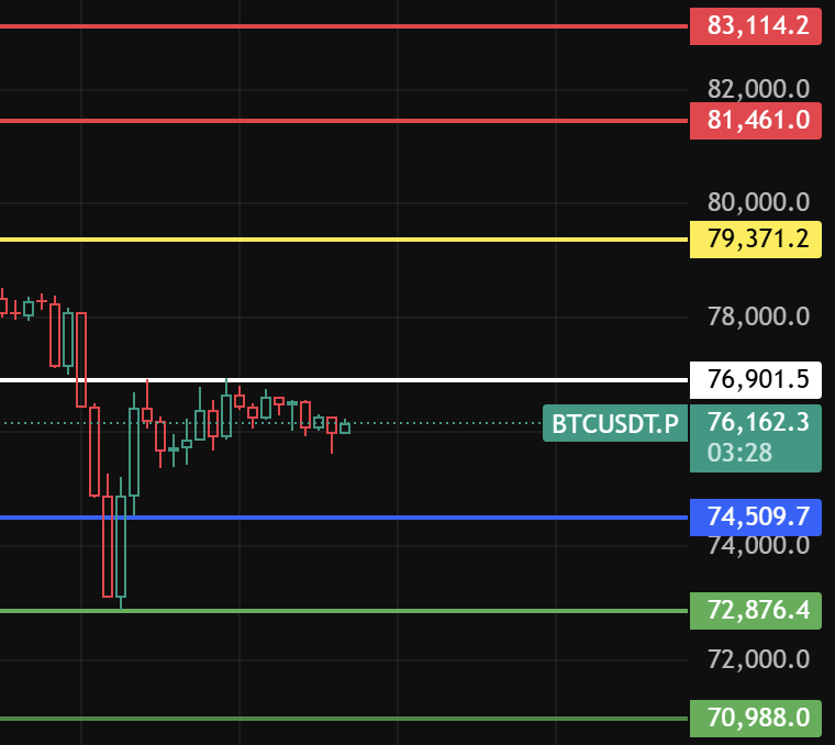 Pay attention to the position of 76900 at night for Bitcoin. Only if it stabilizes above this position for the 1-2 hour level can the rebound begin. Pay attention to the resistance levels around 79370-81460-83115!