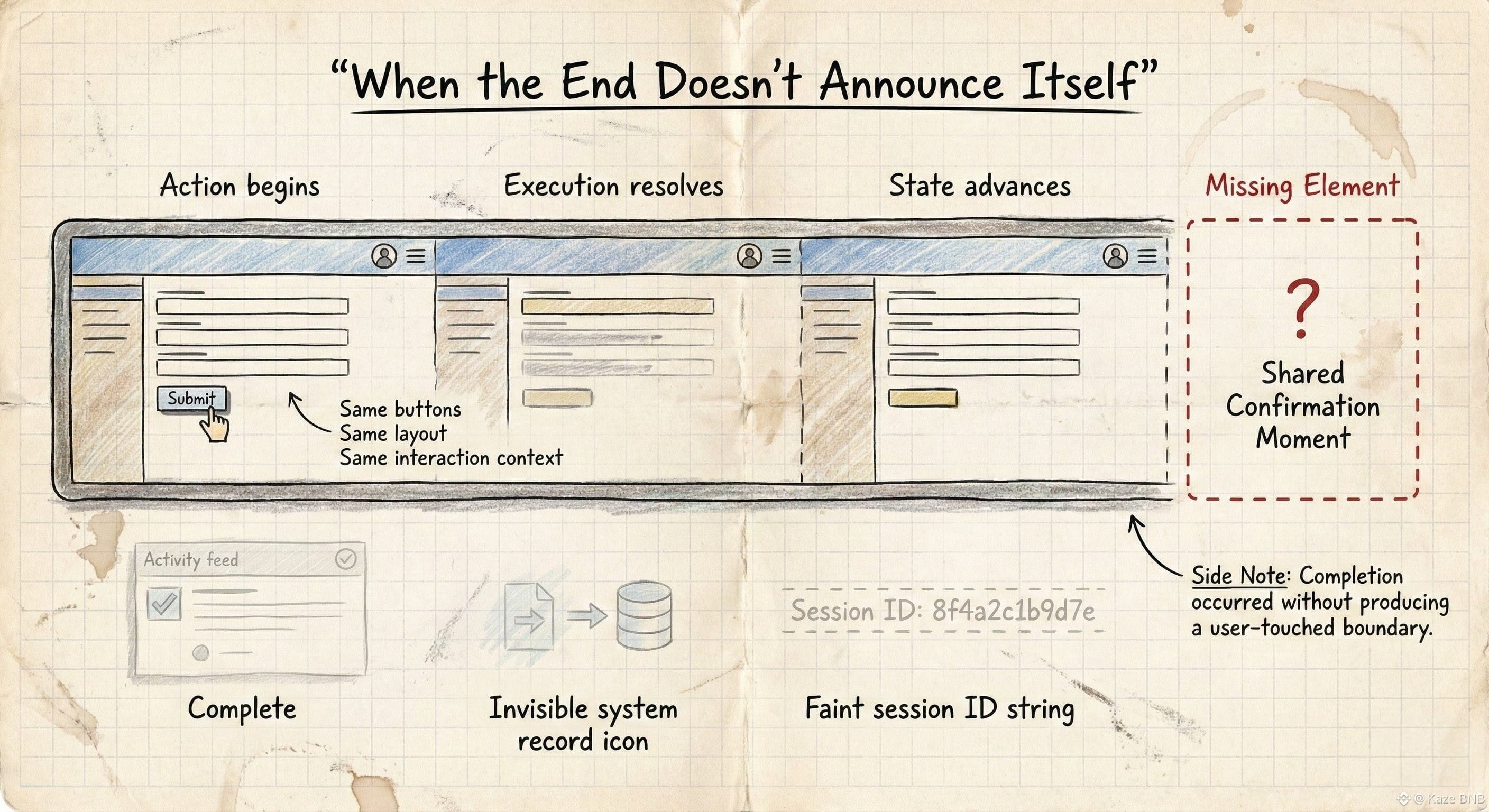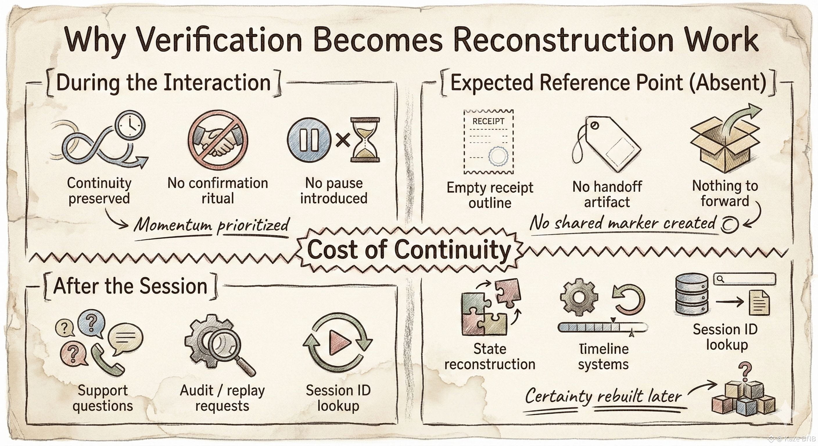 I don’t notice this while the interaction is happening. I notice it afterward, when certainty is requested instead of progress. When someone asks which action counted, where the confirmation lives, or how to point to the exact moment responsibility shifted.