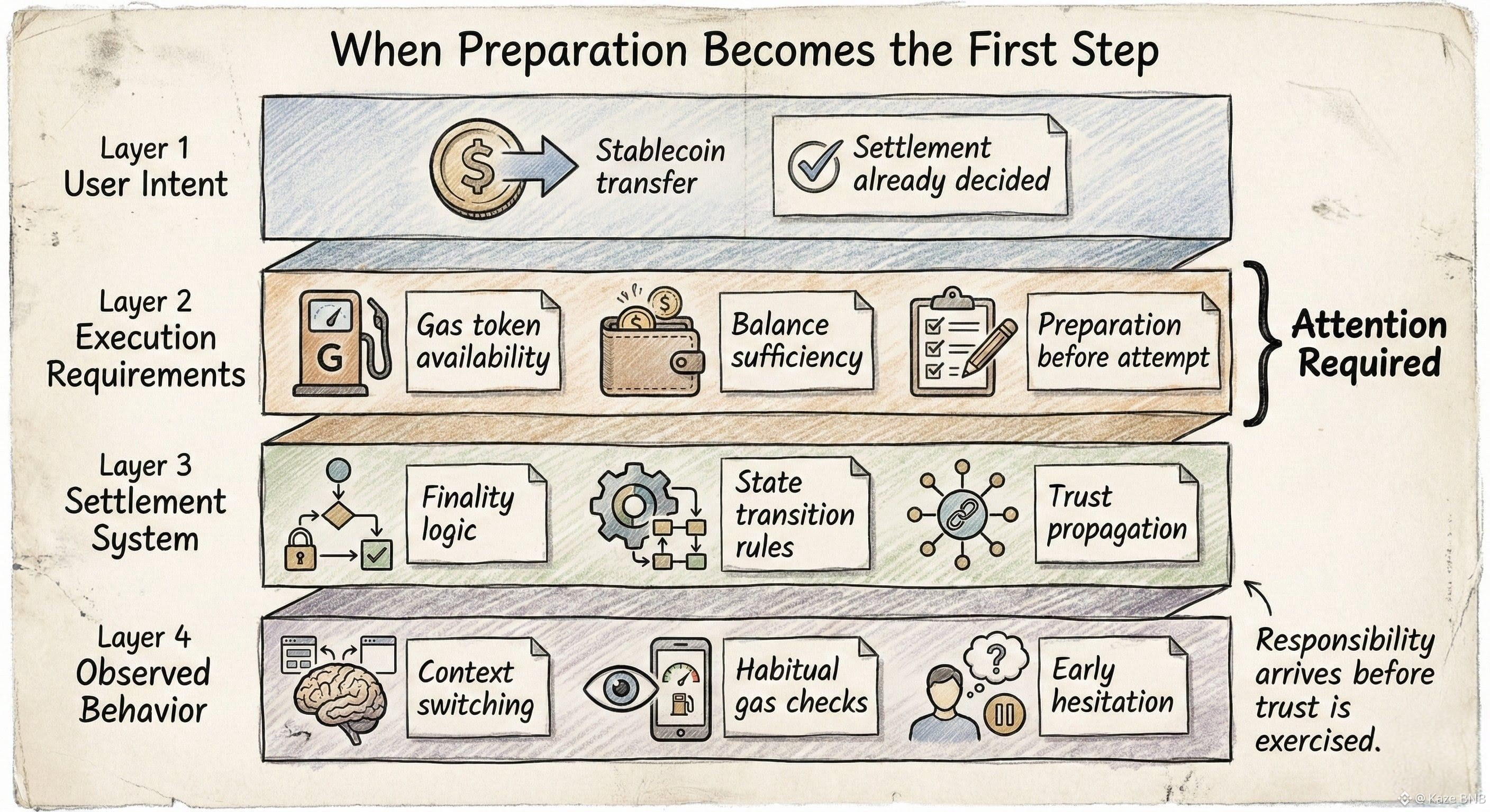 Plasma’s stablecoin-first design pushes against that. Gasless USDT transfers, stablecoin-denominated gas, and a stablecoin-centric posture reduce the number of reasons a workflow needs to pause before it even begins. The pre-flight ritual, top up gas, check balances, re-check timing, doesn’t get as much room to expand. The payment path becomes closer to what people actually think they’re doing: moving dollars, not managing a second volatile dependency just to move stable value.