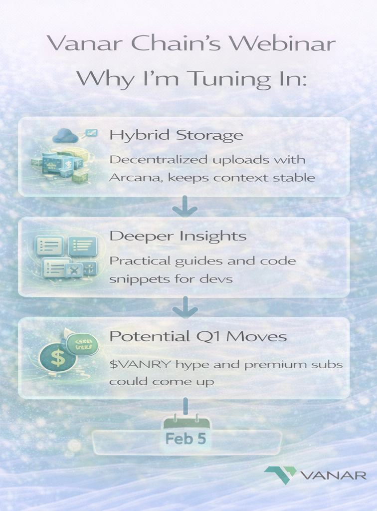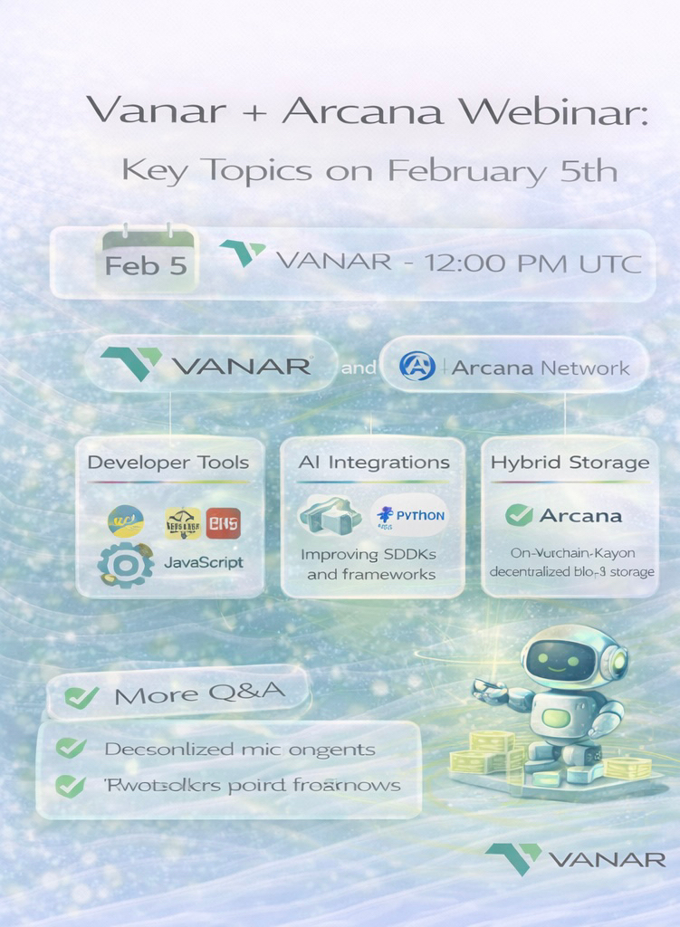From what I’ve pieced together (their site lists it under events, and Coindar picked it up too), it’s likely focused on developer tools, AI integrations, or how Arcana’s stuff (they do decentralized storage and identity) plays with Vanar’s Neutron/Kayon layer. I’ve been building small agents myself—last night I split one into modular microagents for risk assessment on mock RWAs, using Seeds for context and Kayon to coordinate. It worked smoothly on testnet, but storage for larger datasets could get clunky without better off-chain options. If the webinar dives into Arcana + Vanar for hybrid storage (on-chain verification with decentralized blobs), that could fix exactly the pain I hit.