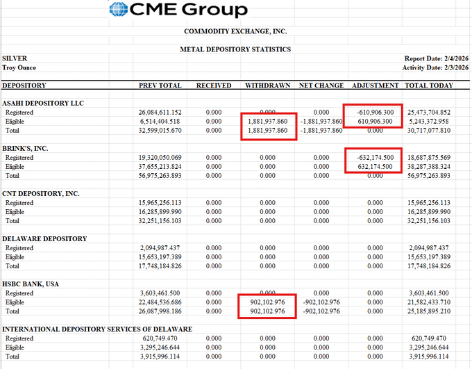 🔷 According to the statistics report for the activity on 03/02/2026, a total of 3,066,617.296 Ounces of Silver have been completely withdrawn from the COMEX storage facilities.