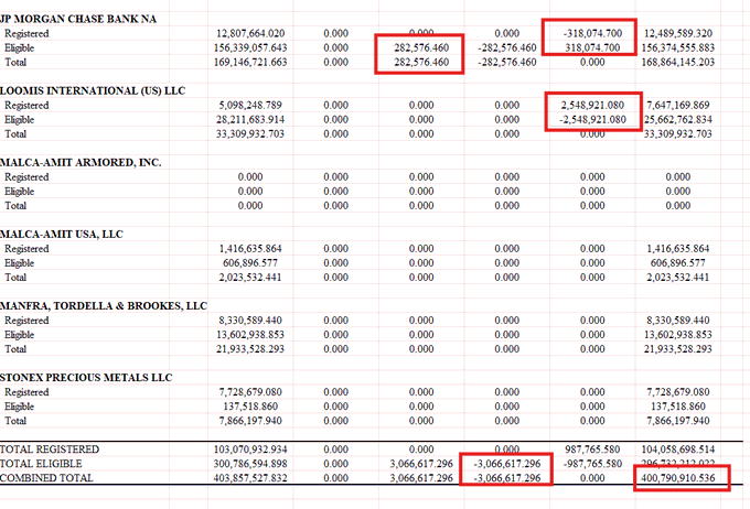 The Withdrawal Group: A large amount of silver has been transferred from Registered to Eligible status (halted for sale/pending withdrawal), including: