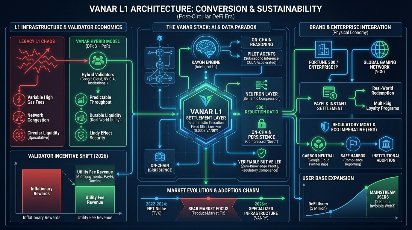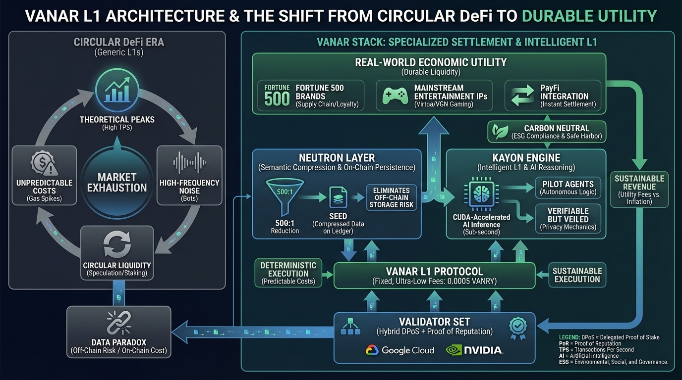 @Vanarchain . The current market exhaustion with generic Layer-1 scaling solutions highlights a fundamental disconnect between technical throughput and actual economic utility. For years, the industry has chased theoretical peaks hundreds of thousands of transactions per second while ignoring the reality that most of that capacity remains empty or filled with the high-frequency noise of arbitrage bots. Vanar enters this landscape not as another entrant in the "TPS arms race," but as a specialized settlement layer designed to solve the specific friction points that have kept Fortune 500 brands and mainstream entertainment IPs confined to the walled gardens of Web2.