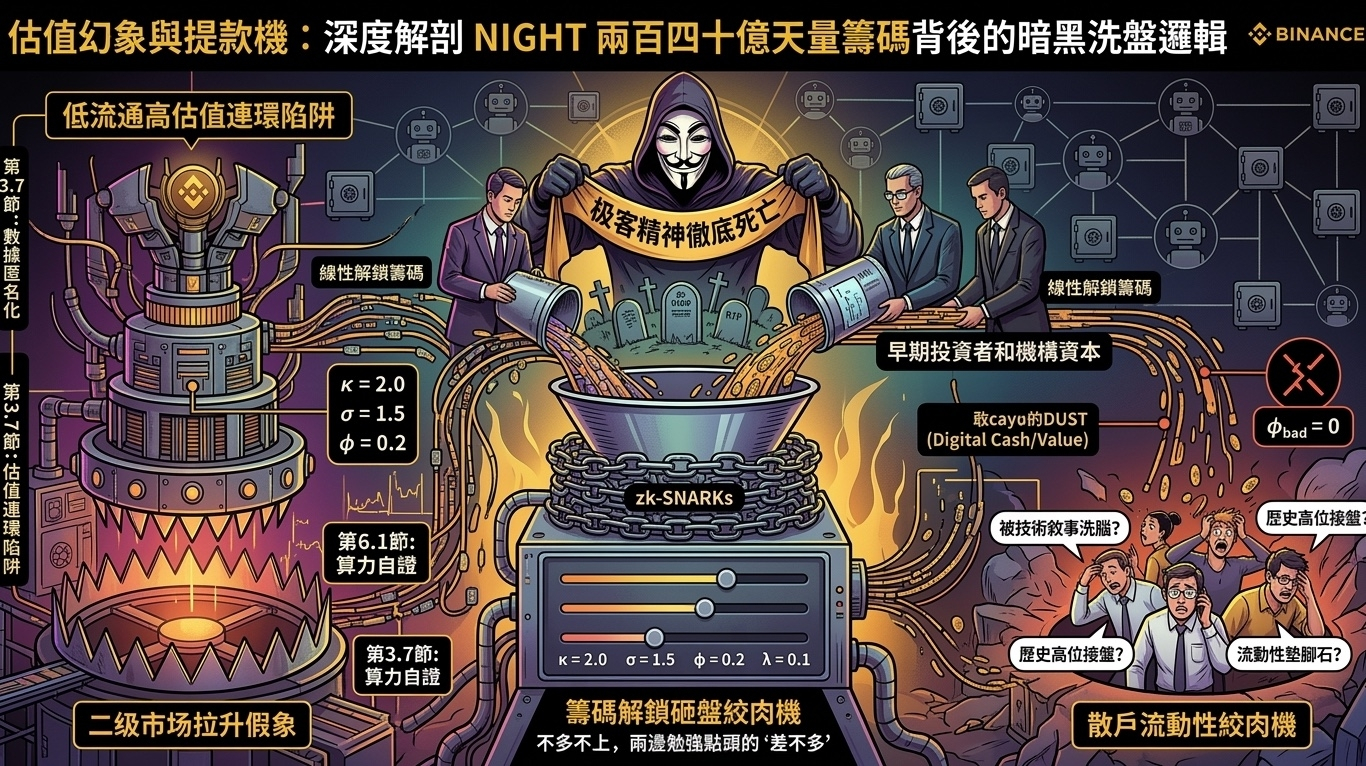 那两百四十亿枚天量筹码中绝大部分正静静地躺在机构投资团队和生态基金的锁仓地址里等待着时间解锁的达摩克利斯之剑落下。一旦那漫长而隐秘的线性解锁周期到达临界点那些在早期以近乎零成本获取海量筹码的华尔街老钱就会毫不留情地将解禁的代币疯狂砸向二级市场。散户们用真金白银苦苦支撑的流通市值在天量解锁的狂暴抛压面前简直就像纸糊的防御工事一样不堪一击。NIGHT 这种极其庞大的筹码基数和漫长的释放周期注定了它绝对不是一个可以让散户短期暴富的投机标的而是一场极其漫长的筹码换手与机构洗盘的持久战。如果你在没有彻底算清楚这笔筹码解锁账本之前就盲目重仓你所做的一切都只是在为那些顶级掠食者的离场提供最完美的流动性垫脚石。
