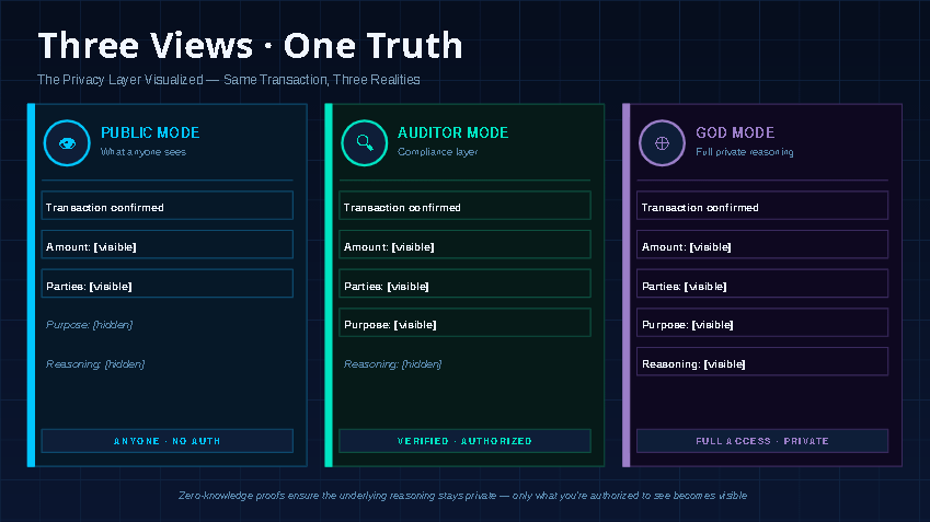 Toggle to Public view and you see what any stranger onchain would see. Switch to Auditor mode and additional layers of verified detail open up the kind a regulator or compliance engine would need. Then there's God mode, where the private motivations, personality traits, and hidden reasoning of each agent become visible. The same underlying transaction looks completely different depending on who's looking and what they're authorized to see.