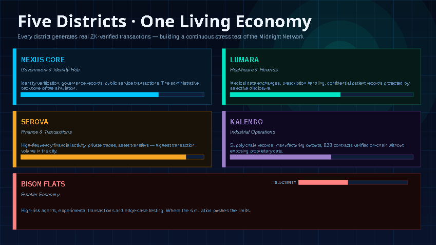 @MidnightNetwork City isn not a concept art piece or a metaverse money grab. It's a live, always on stress test disguised as a simulation. The entire environment is populated with autonomous AI agents that have distinct personalities, private goals, longt erm memory, and evolving behavioral patterns. These agents live, work, and transact across five districts from the industrial core of Kalendo to the frontier zone of Bison Flats generating a continuous, unpredictable stream of real transactions on the actual Midnight network.