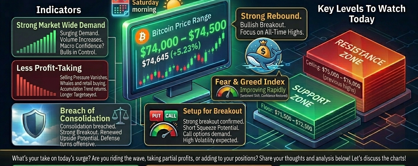 $BTC is rebounding strongly today, trading around $74,000 – $74,500 with over 5% gains in the last 24 hours.