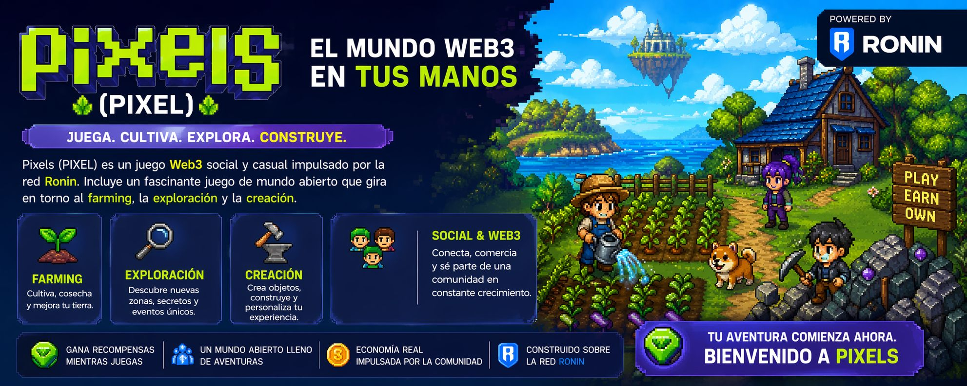 Si te gustan los videojuegos relajados pero con un toque innovador, Pixels (PIXEL) es una propuesta que no puedes ignorar. Este juego Web3, impulsado por la red Ronin, combina lo mejor del entretenimiento casual con las oportunidades del mundo blockchain. Aquí no solo juegas… también construyes, exploras y formas parte de una economía digital en crecimiento.