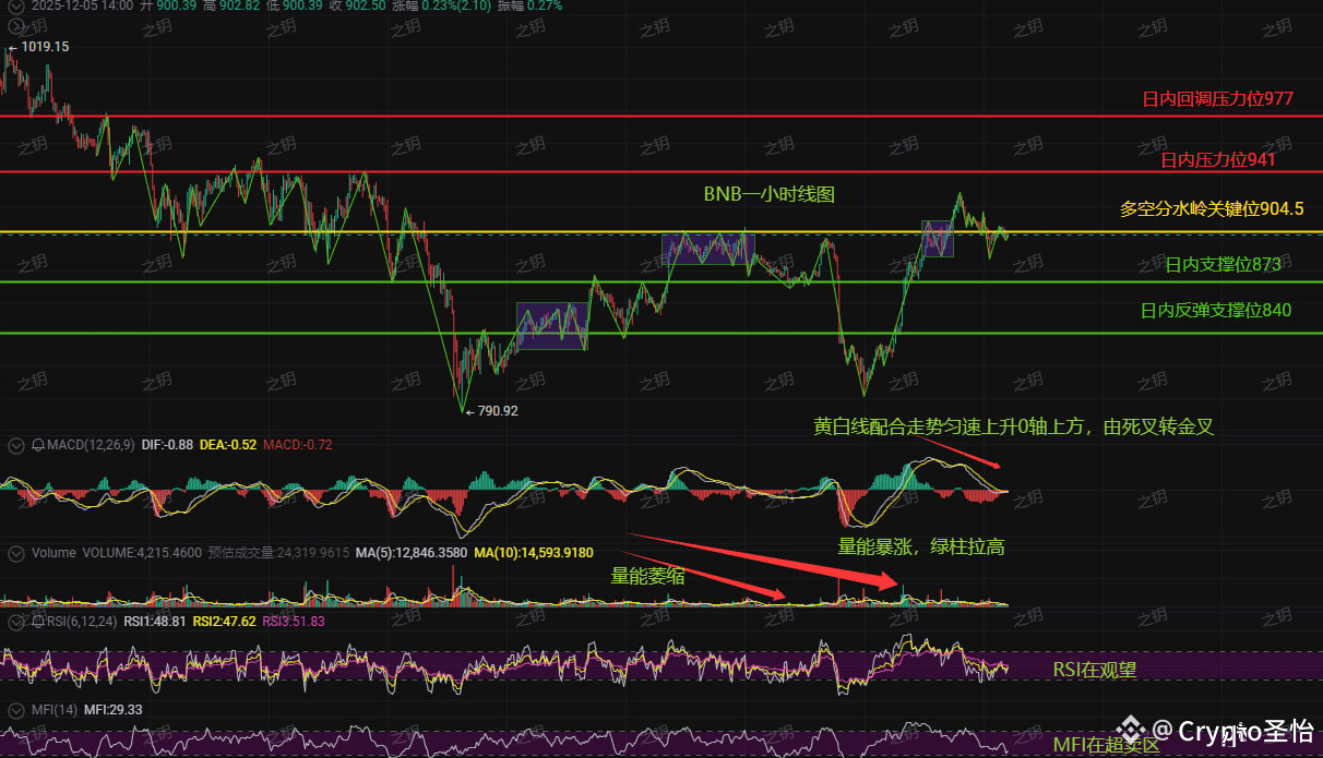 今天盯盘的时候,我发现BNB小时图正在悄悄酝酿一个大动作——MACD黄白线在0轴上方匀速上升,死叉转金叉,绿柱突然拉高!