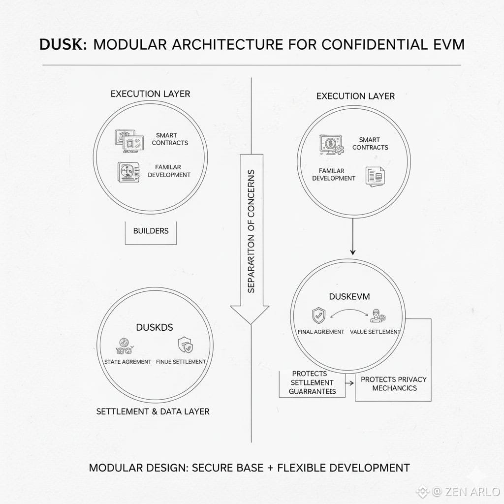 Dusk Behind the scenes, the project is not built as a single monolith. Dusk is modular by design. It separates the settlement and data layer from the execution layer. In plain terms, DuskDS is where the chain agrees on state, reaches final settlement, and validates how value moves. DuskEVM is where smart contracts run in an EVM equivalent environment. That split is important because it lets Dusk protect its settlement guarantees and privacy mechanics at the base, while still offering a familiar development environment for builders who want EVM style tooling.