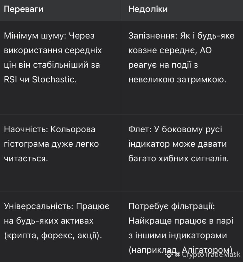 На відміну від багатьох інших осциляторів, AO не використовує ціни закриття (Close). Замість цього він базується на середній ціні (Median Price) кожного бару.