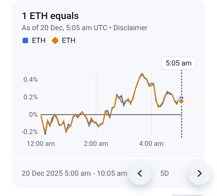Ethereum se está negociando aproximadamente a $2,982.38 por ETH a partir del 20 de diciembre de 2025, un ligero aumento desde los recientes mínimos a medida que la presión de venta disminuye alrededor del nivel de soporte clave de $2,900. El precio actual refleja un periodo de compresión y estabilización tras un prolongado declive desde sus máximos de octubre, con una resistencia significativa por encima.