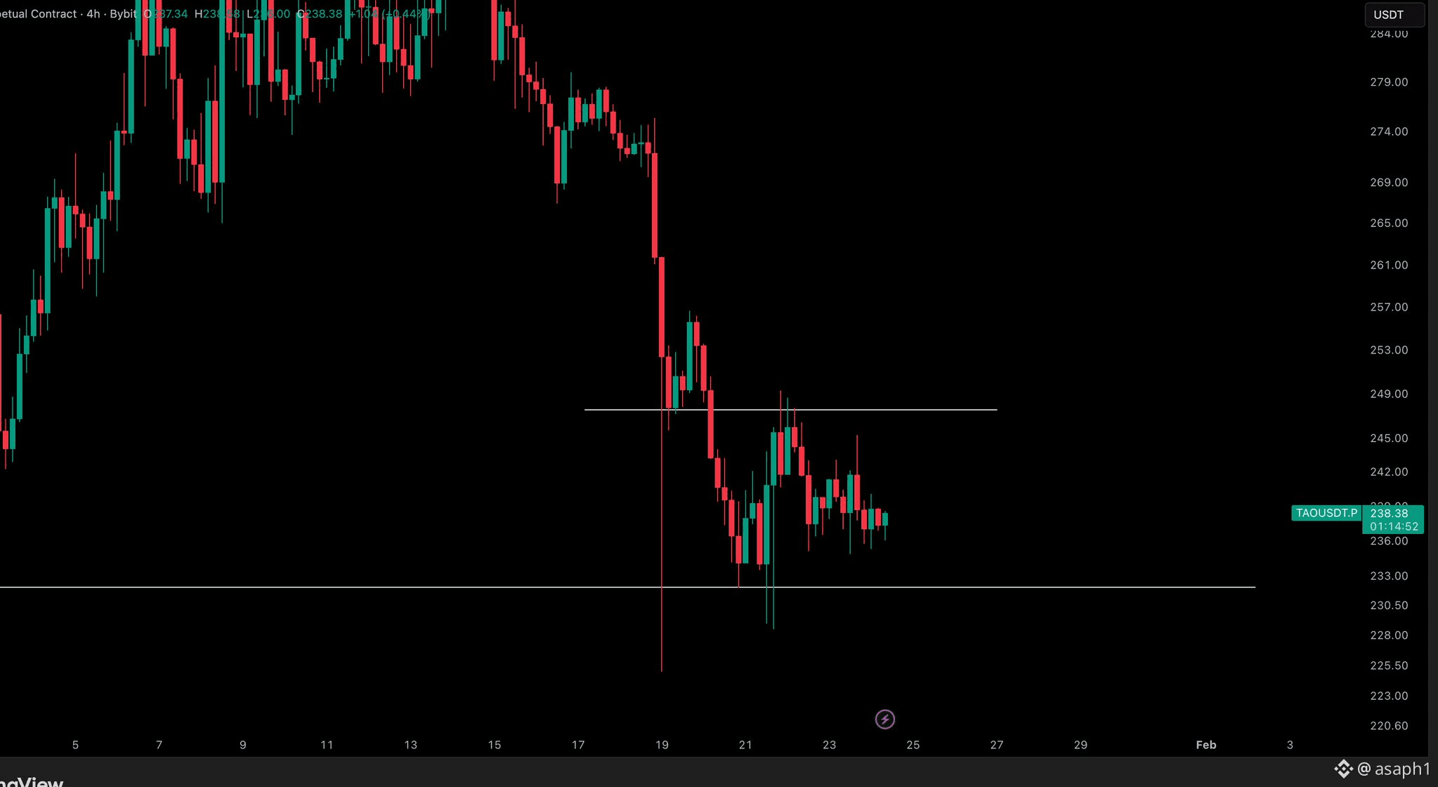 Mira bien la gráfica que me pasaste, porque ahí está el mapa de la guerra. 📉 El precio de TAO está peleando en un lodo técnico bien denso. Después de haber tocado las nubes por encima de los $280 a principios de enero de 2026, lo tenemos ahora mismo estancado en la zona de los $238.
