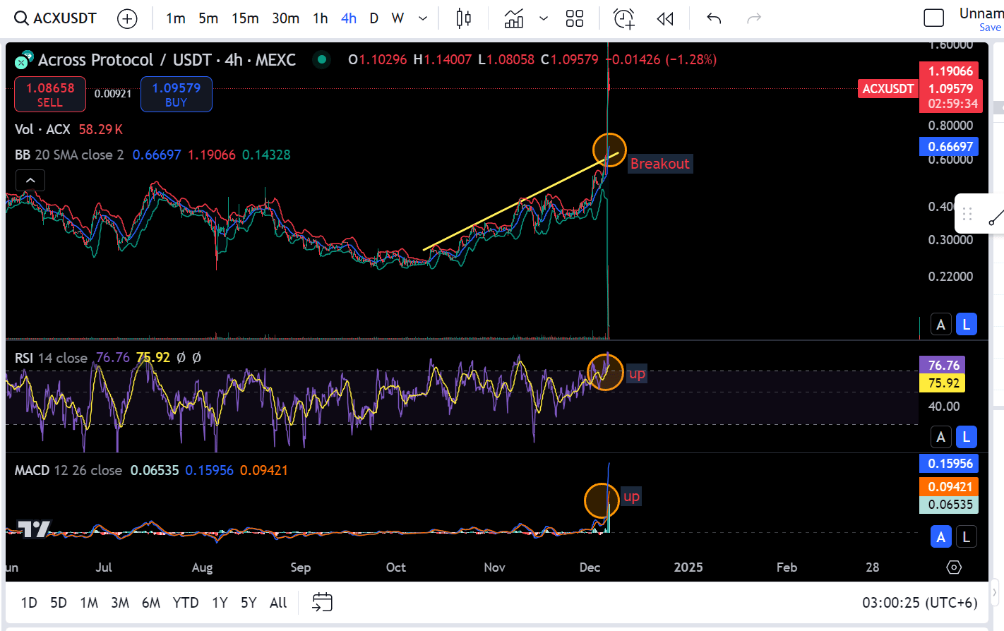 En el gráfico podemos ver que la moneda ACX ha superado su nivel de resistencia y está bajando para una re-prueba. Todos los indicadores mostrados en la imagen muestran UN GRAN ALCISTA.