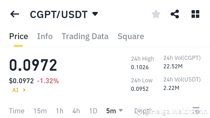 El par CGPT/USDT se está negociando actualmente a $0.0972, mostrando una caída del -1.32% en las últimas 24 horas. El máximo de 24 horas fue de $0.1026, mientras que el mínimo alcanzó $0.0952. El volumen de comercio se sitúa en 22.52M CGPT, indicando una participación activa en el mercado.