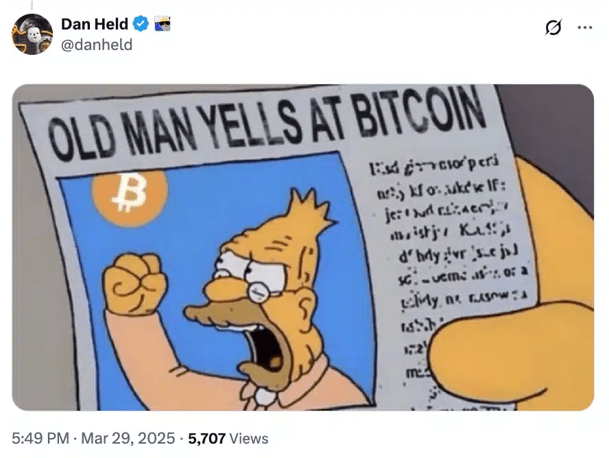 El destacado defensor de Bitcoin, Dan Held, también se unió a la conversación, burlándose de Schiff con un meme y sugiriendo que las constantes críticas de Schiff han perdido su impacto.