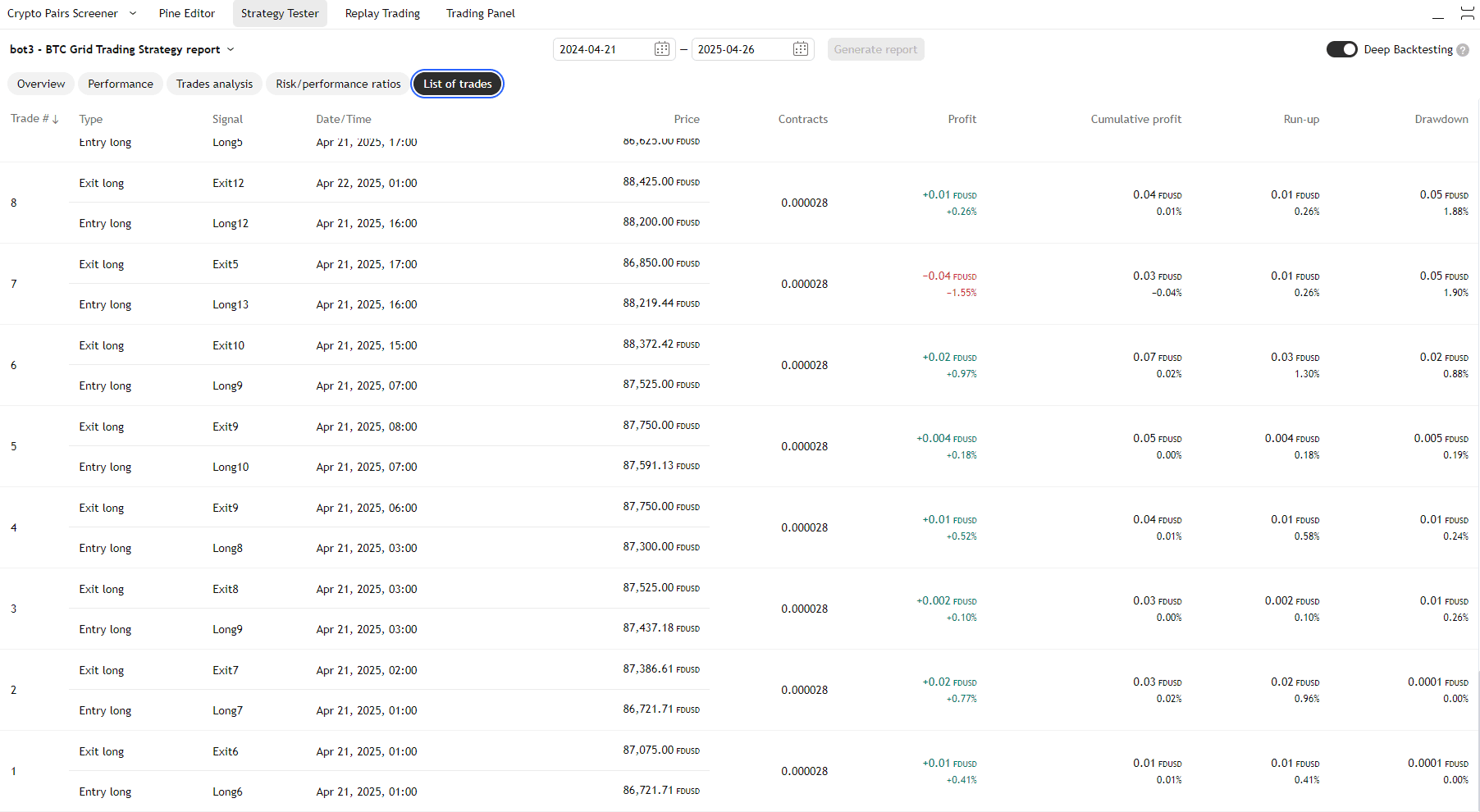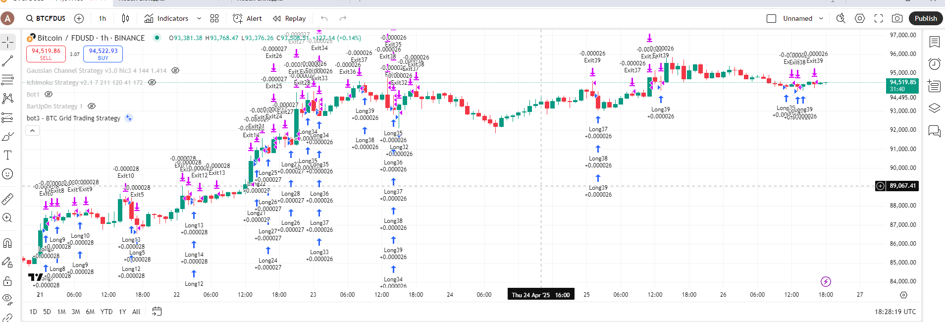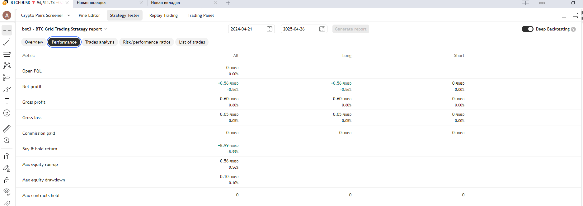 ¡Hola a todos! Hoy, decidí escribir mi primer artículo dedicado a estudiar la rentabilidad de #bot_trading s. Tenía una pregunta: ¿cómo se relaciona el ingreso del trading con un bot de cuadrícula a una posición larga simple? ¿Qué es un bot de cuadrícula?: el capital se divide automáticamente por el número de cuadrículas, y al alcanzar el precio apropiado, se activa la orden del BOT, tanto corta como larga. ¿Qué es una orden larga?: como sabemos, ha estado creciendo todo el tiempo, casi desde su inicio, aunque ha habido fallos temporales con bastante frecuencia en su historia de precio $BTC , pero en general, una persona que hubiera invertido una cantidad mínima hace 2-3 años podría haberse hecho rica. Por lo tanto, decidí comprobar qué es más rentable: un bot de cuadrícula o comprar un activo, en este caso, $BTC , en un momento determinado y venderlo después de algún tiempo. Para el análisis, tomé la tendencia alcista del 21 de abril de 2025 al 26 de abril de 2025. Usé el programa TradingView, creé una estrategia aproximada para el bot, a través del script Pin con la ayuda de IA, y obtuve el resultado, por supuesto, no a la primera. Pero veamos estos resultados: La primera imagen es un gráfico del comportamiento del precio de $BTC/$FDUSD $FDUSD- stablecoins en el intercambio de Binance. Vemos una tendencia alcista con una pequeña corrección de precio. La siguiente imagen es la pestaña de Análisis de Estrategia - una herramienta incorporada en TradingView. Vemos una ganancia neta de +0.56 por ciento para el período. Esto significa que nuestro #bitcoin ot ganó aproximadamente medio por ciento de los fondos invertidos en estos 5 días. No está mal, pero veamos el período de retorno de compra y retención, donde veremos cuánto podemos ganar si compramos bts desde el principio del período y lo vendemos al final! ¡Casi un 9 por ciento!!! La diferencia es enorme, y de inmediato surge la duda en los resultados, y de hecho, podemos ver en la Figura 3 que mi estrategia generada no copia completamente el bot de cuadrícula de Binance - por ejemplo, solo vemos posiciones largas y no vemos cortas. Todavía no sé por qué no funciona... En segundo lugar, por supuesto, el $BTC gráfico de precios no tiene solo tendencias alcistas, pero esto también afectará el resultado de esta competencia. En tercer lugar, los parámetros específicos del bot también afectan. Pero la lógica también sugiere: ¡es mejor comprar barato una vez y luego vender a un precio caro! La única pregunta es ¿cuándo????