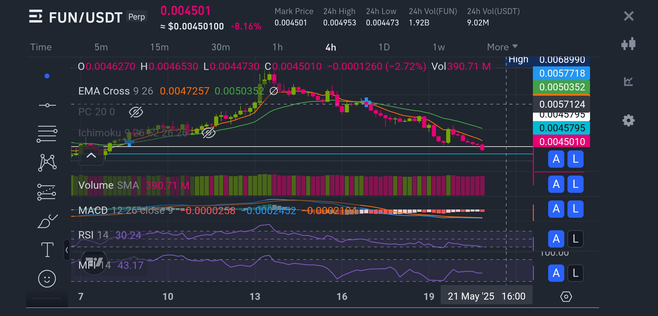 Gráfico de 4H: $FUN está cotizando a $0.0035, por encima de la Nube de Ichimoku (alcista). El volumen es estable en $1.2M, con RSI en 58 (neutral, espacio para crecer). MACD muestra un cruce alcista, y CMF en +0.05 indica presión de compra leve. El soporte está en $0.0033, resistencia en $0.0037.