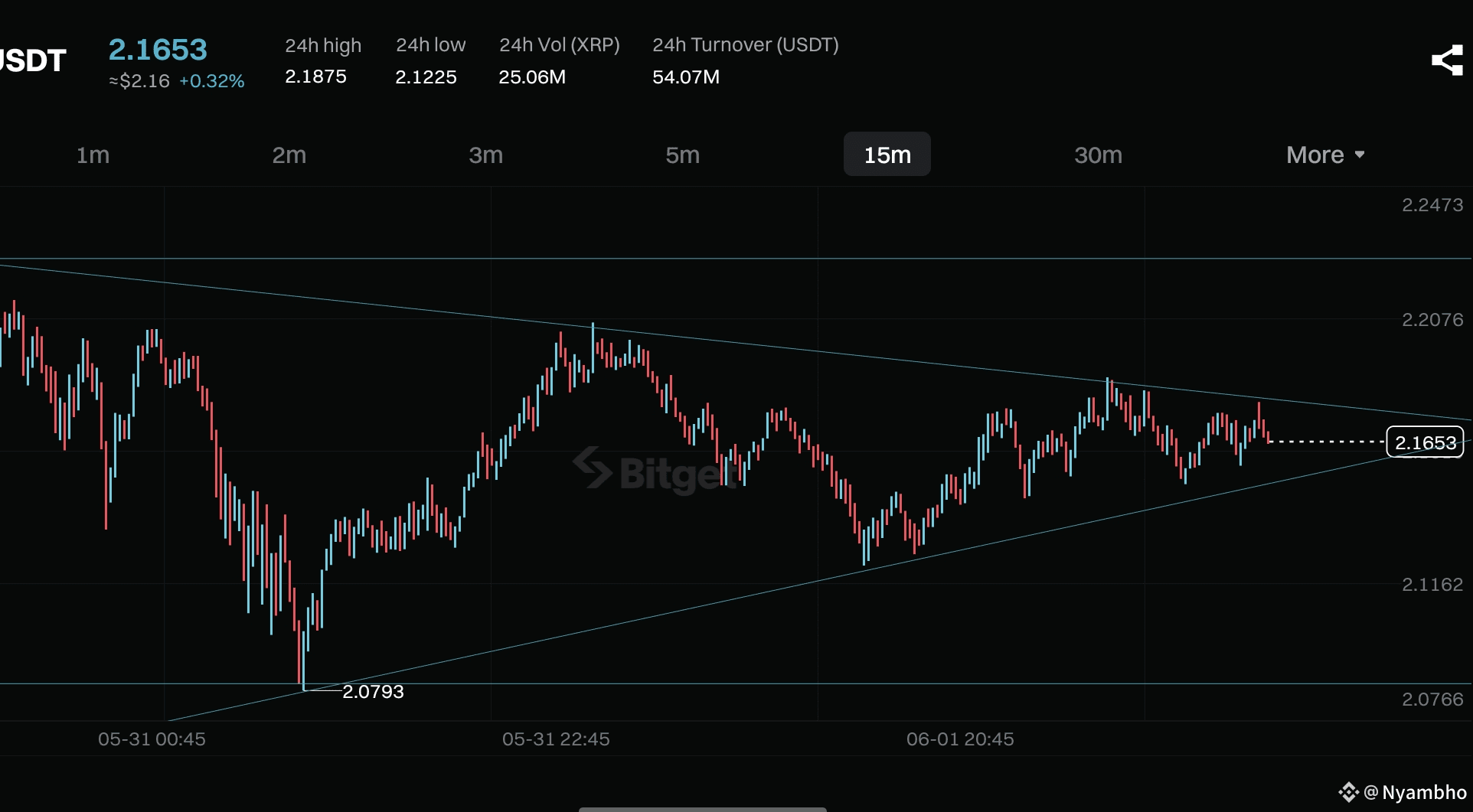 XRP se está consolidando actualmente dentro de un triángulo simétrico, formando máximos más bajos y mínimos más altos, indicando una compresión ajustada antes de una posible ruptura.