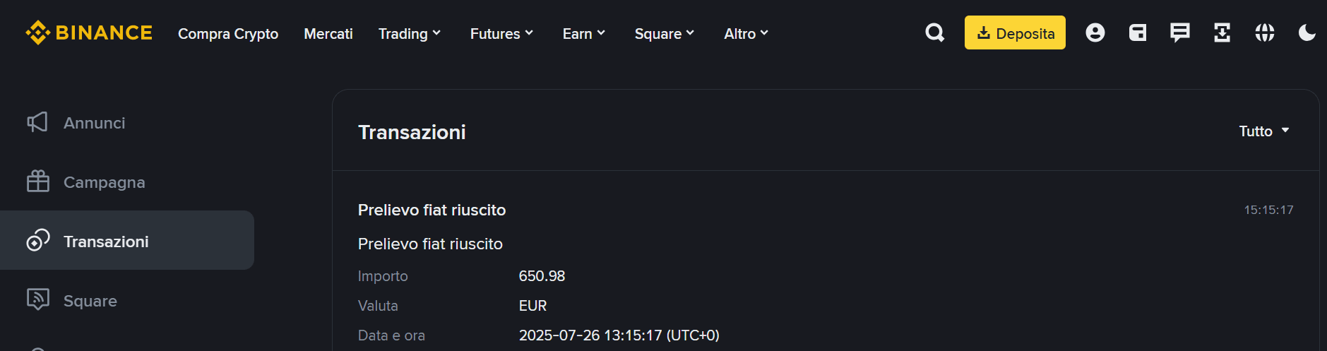 Quería compartir con ustedes mi experiencia extremadamente positiva esta vez (después del episodio fallido con Revolut) con una retirada fiat realizada hoy de Binance hacia mi cuenta corriente de Poste.it.
