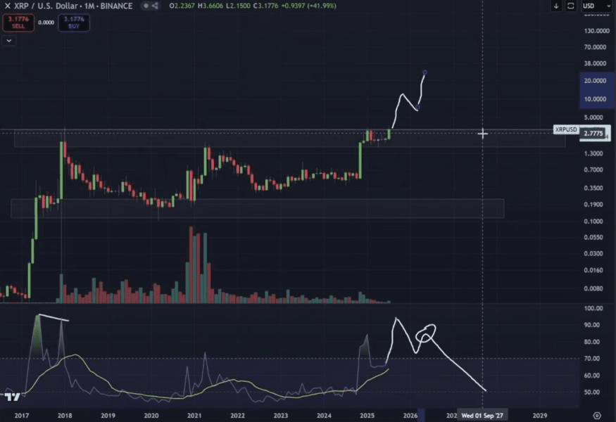 Apoyando el caso alcista está una señal técnica que muchos observadores del mercado han pasado por alto: un regreso del Índice de Fuerza Relativa (RSI) mensual de XRP a la zona de sobrecompra, históricamente un precursor de rallies parabólicos. En el ciclo de 2017, un patrón RSI similar precedió un movimiento de más del 700%, e incluso una repetición “conservadora” podría llevar a XRP a muy por encima de $10, explicó. “Si hacemos un máximo más alto en el RSI mensual aquí, para mí eso no indica que el movimiento haya terminado,” dijo, enfatizando que los indicadores de momentum permanecen firmemente en territorio alcista.