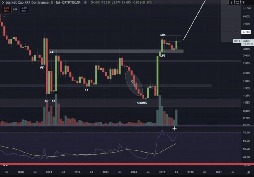 Al observar la dominancia de XRP—una medida de la participación de la capitalización de mercado de XRP en relación con el resto de las criptomonedas—CryptoInsightUK notó que el token está manteniendo el punto medio de un rango formado sobre lo que él llama la fase de “signo de fuerza”. “Hemos creado este rango sobre la acumulación de Wyckoff... Las cosas también se ven bien allí,” dijo.