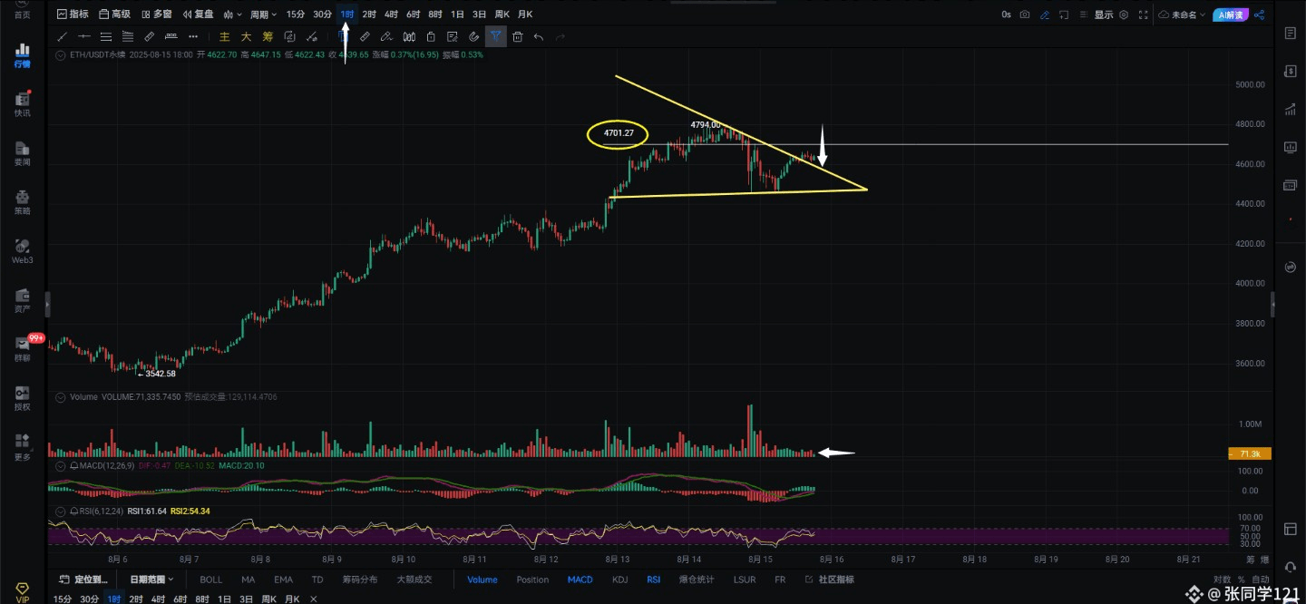 Además, a nivel de 4 horas, la posición indicada por la flecha blanca ha formado un doji de alto nivel. Para subir, primero necesita romper este doji de alto nivel, el precio correspondiente es 4652. Mirando la posición circunscrita por el cuadro amarillo abajo, desde la caída de anoche, el 2º pie a nivel de 4 horas ha subido 5 velas alcistas, pero ves, el volumen de estas 5 velas alcistas está cada vez más bajo; este es un aumento de volumen en contracción. ¿Dices que un aumento de volumen en contracción aún puede subir?