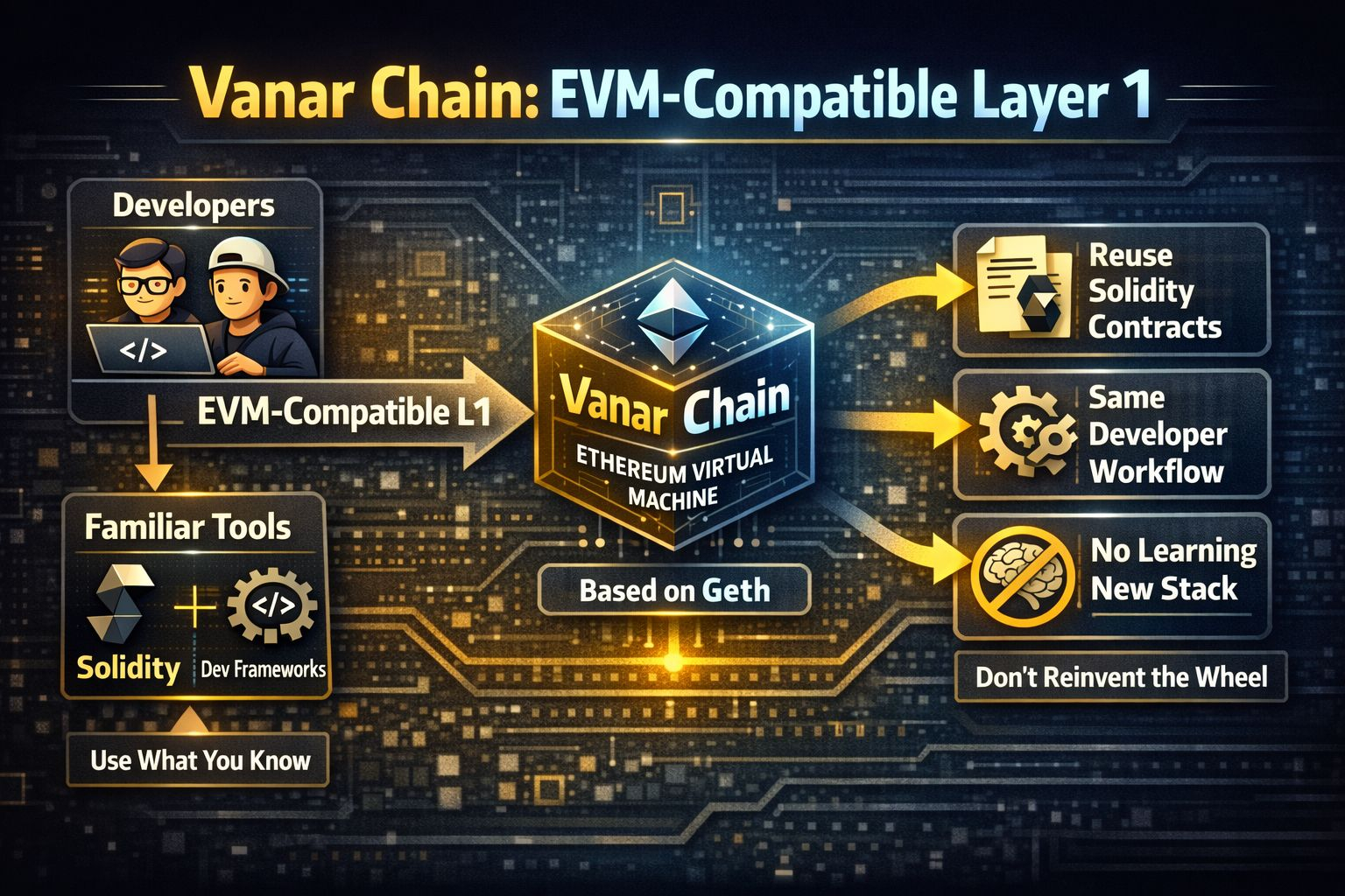La propuesta de Vanar a los desarrolladores se sitúa justo en ese punto de dolor: reducir el tiempo de configuración y permitir que los creadores envíen más rápido aprovechando lo que ya saben. Vanar Chain está posicionado como una Capa 1 compatible con EVM, lo que significa que si has construido para entornos al estilo de Ethereum antes, no estás comenzando desde cero. “EVM” (Máquina Virtual de Ethereum) es básicamente el entorno de ejecución que ejecuta contratos inteligentes; la compatibilidad significa que a menudo puedes reutilizar los mismos contratos de Solidity, los mismos marcos de desarrollo y el mismo modelo mental, en lugar de aprender un conjunto completamente nuevo. El propio repositorio de código de Vanar incluso describe la cadena como compatible con EVM y basada en Geth (el cliente de Ethereum ampliamente utilizado), que es una forma muy “no reinventes la rueda” de reducir la fricción para los desarrolladores.