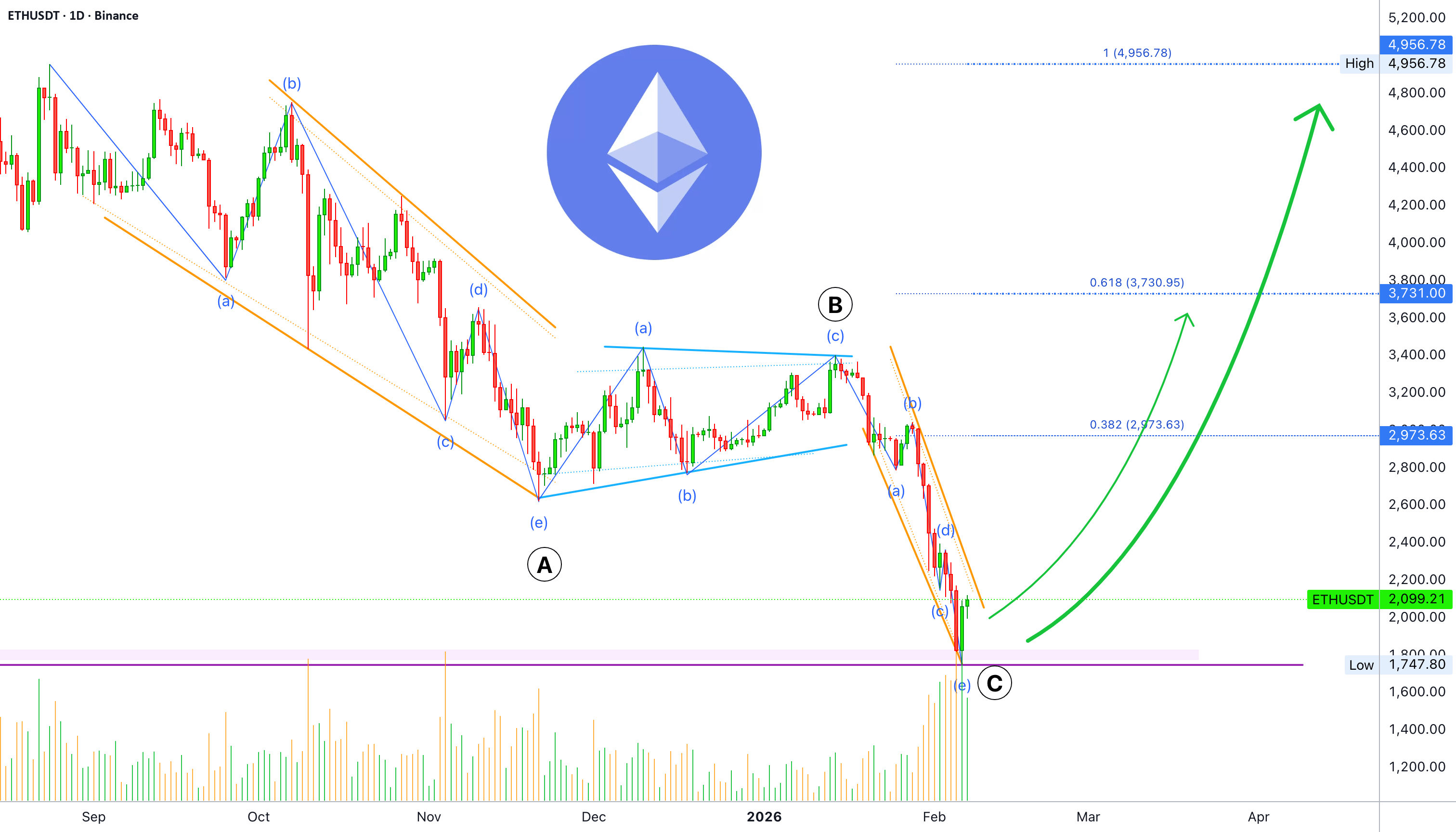 Una vez que este suministro esté completamente absorbido, el movimiento puede ser violento. Las correcciones terminan en alto volumen y ventas emocionales — y eso es exactamente lo que estamos viendo. La estructura sugiere que la fase de corrección está completa. El primer nivel clave se sitúa cerca de $3,000, y una recuperación de esa zona abre la puerta para una continuación al alza. No espero que la recuperación se detenga en 3K — eso es solo el comienzo de la próxima pierna alcista.