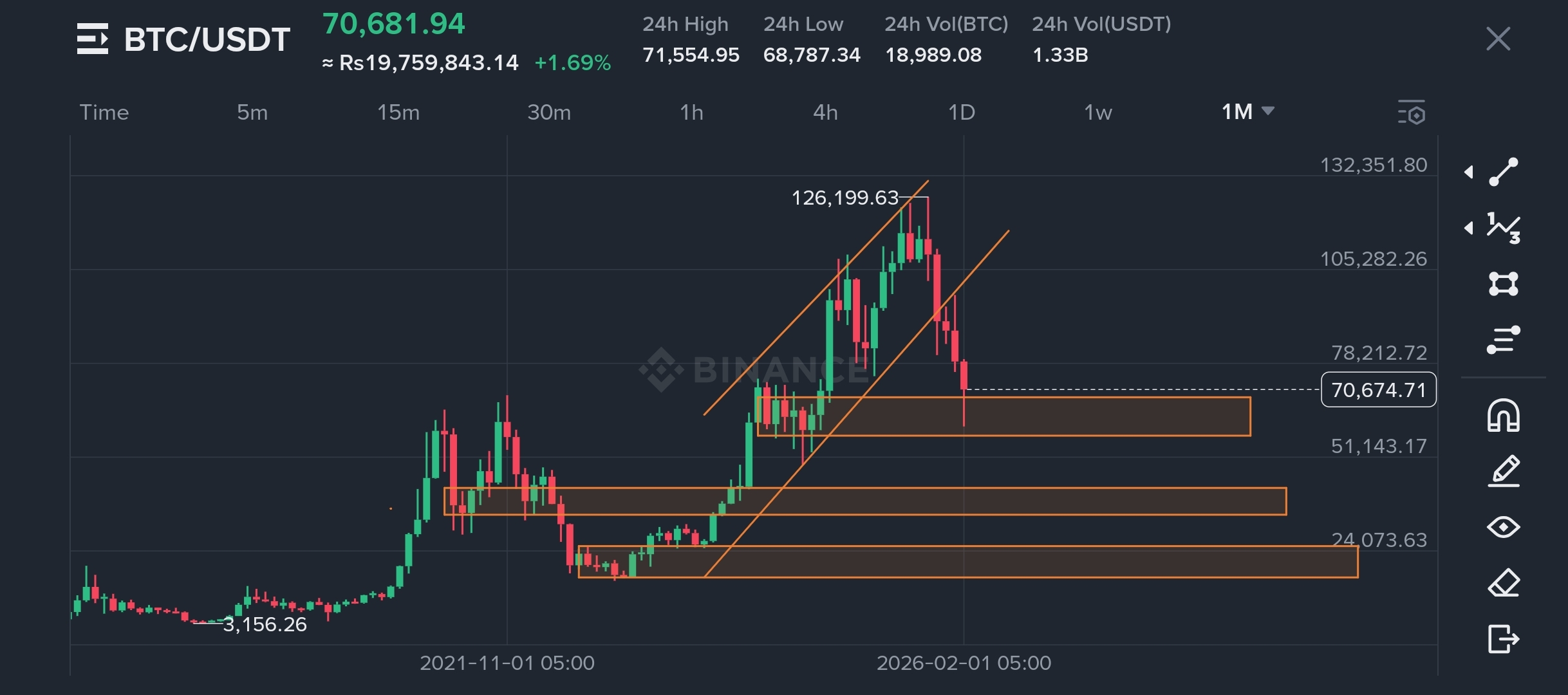 · $73,581 - $70,041: Esta era una zona de soporte importante que ha sido rota. Ahora es una gran área de resistencia.